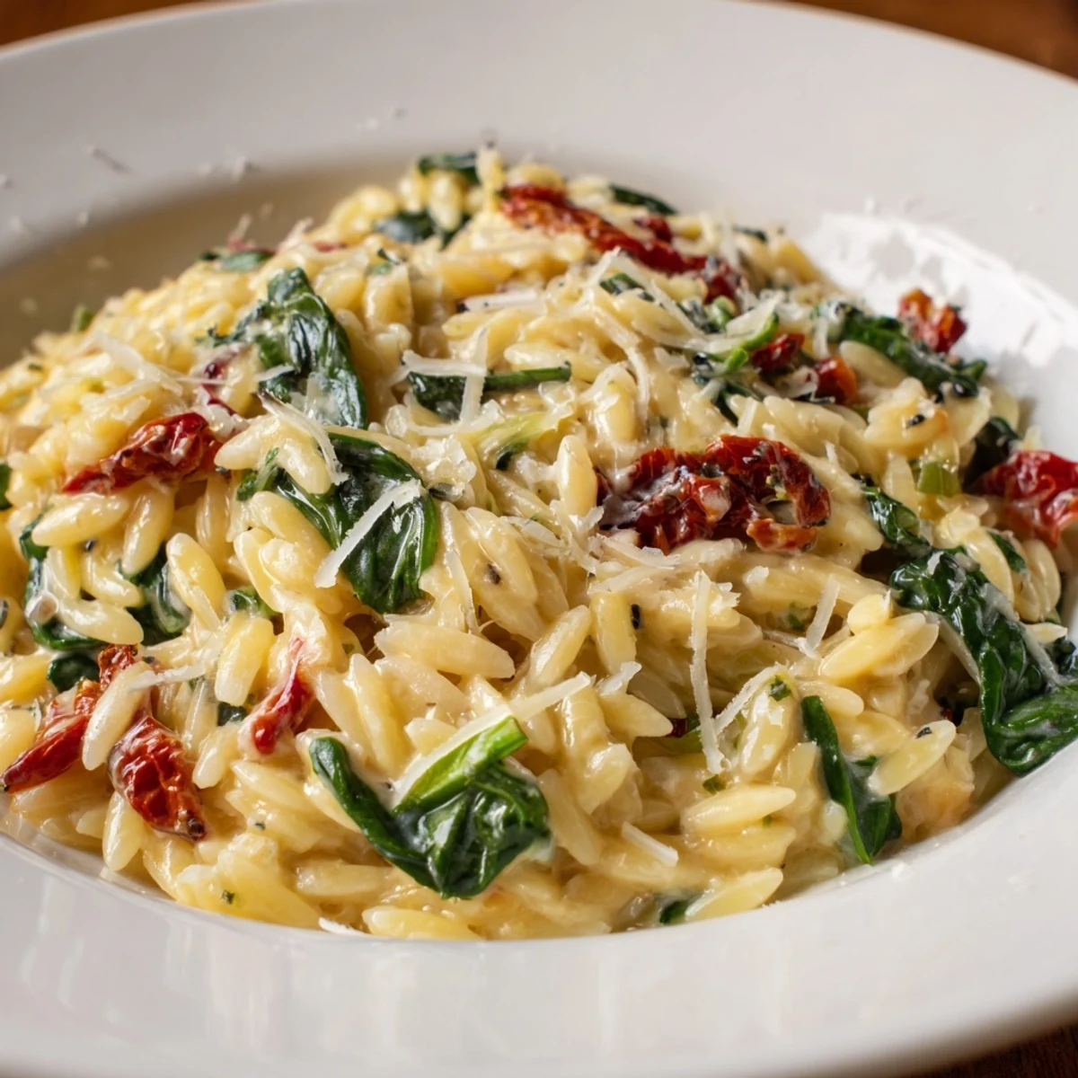 This creamy Tuscan orzo combines tender pasta pearls with sun-dried tomatoes, baby spinach, and freshly grated Parmesan in a velvety sauce. The dish comes together in one skillet, starting with aromatic onions and garlic, then simmering the orzo in vegetable broth until perfectly al dente. A splash of heavy cream creates the luscious consistency, while dried thyme and optional chili flakes add depth. Ready in just 30 minutes, this vegetarian main delivers restaurant-quality Italian flavors with minimal effort.
