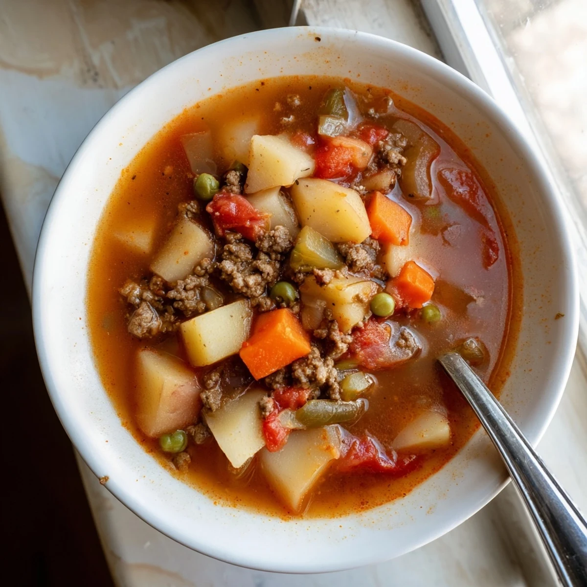The wind was howling against the kitchen window last February, rattling the frames like an impatient guest. I had just come inside from shoveling the driveway, my toes still numb despite three pairs of socks. That is when this soup happened—mostly because I was too cold to plan anything elaborate and the ground beef in the fridge needed to be used tonight.