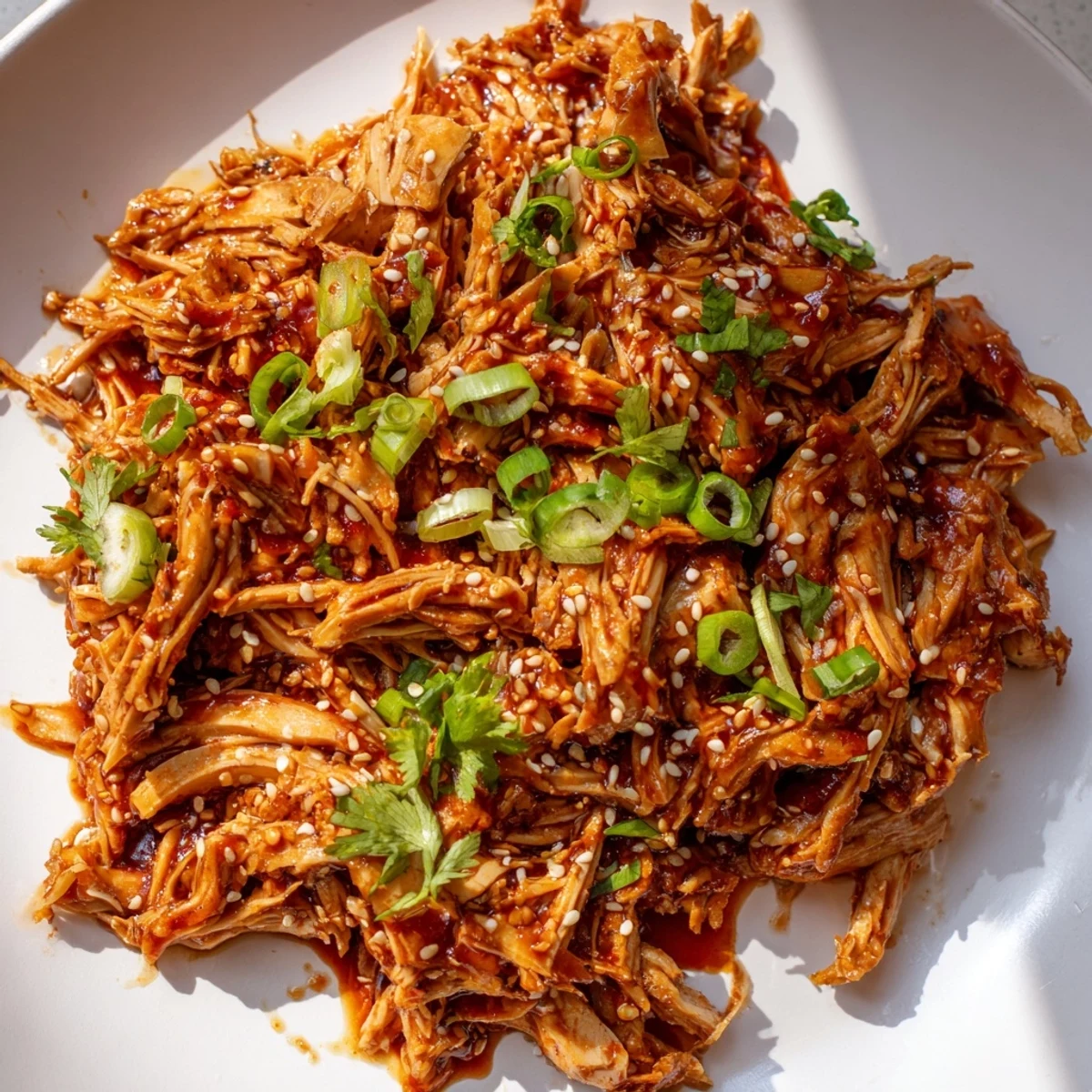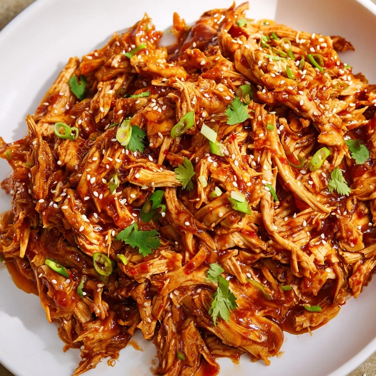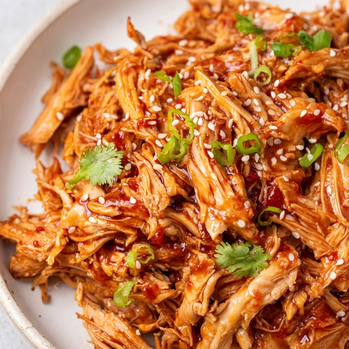 - Toss everything together so every strand of chicken gets coated in that thickened sauce, then sprinkle with fresh toppings right before serving.