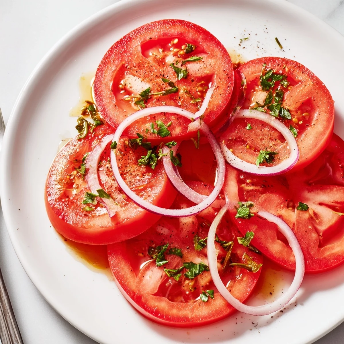 Sunlight used to pour onto my kitchen counter during those late summer afternoons, making the tomatoes glow almost jewel-like as I reached for them. There is something grounding about the sharp scent of onion mingling with ripe tomato—one of those pairings that feels as natural as laughter between good friends. I stumbled onto this salad on a day when I wanted something quick but with real flavor pop, and I've never looked back. Each time I assemble it, the kitchen fills with the bright, clean aroma of parsley and citrus.