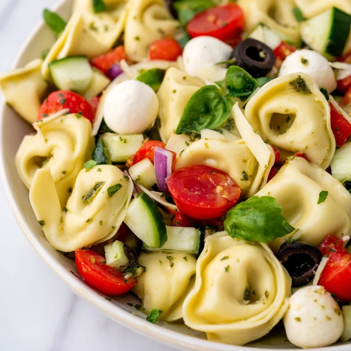 This vibrant bowl combines tender cheese-filled tortellini with cherry tomatoes, crisp cucumber, colorful bell peppers, and tangy black olives. Fresh mozzarella and torn basil add creaminess and aromatic brightness, while homemade Italian dressing with red wine vinegar and Dijon mustard ties everything together.